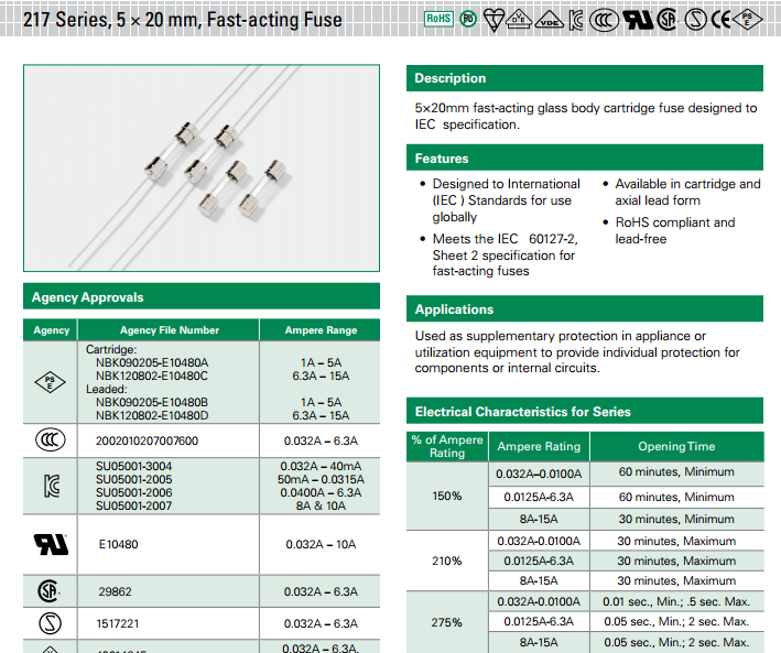 力特保险丝217 系列 - 符合IEC规范的5x20mm快熔型玻璃管保险丝:
